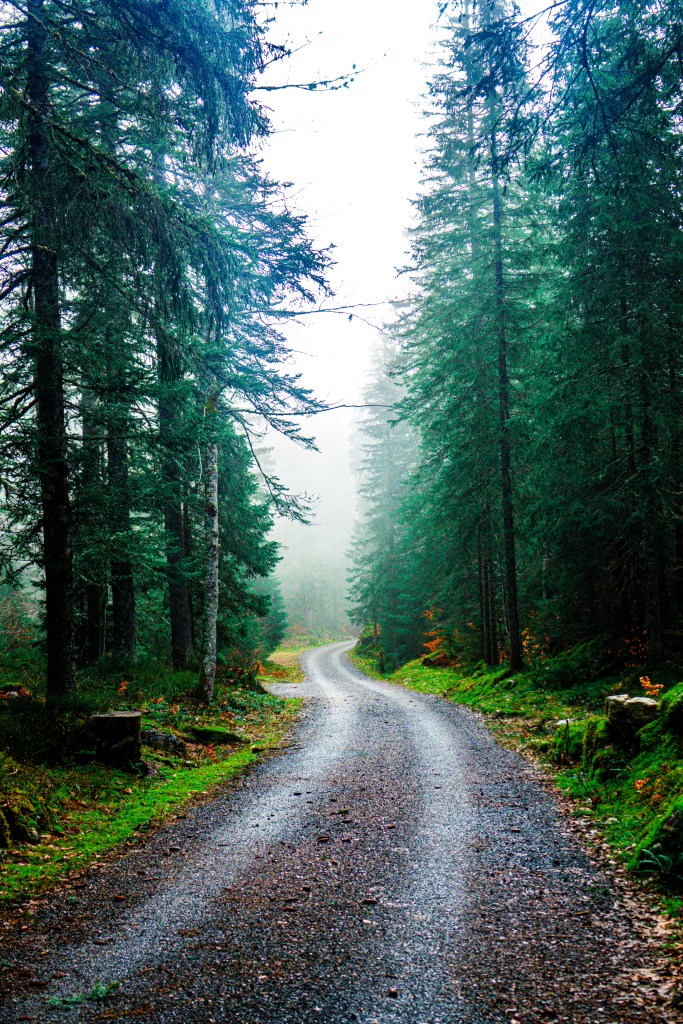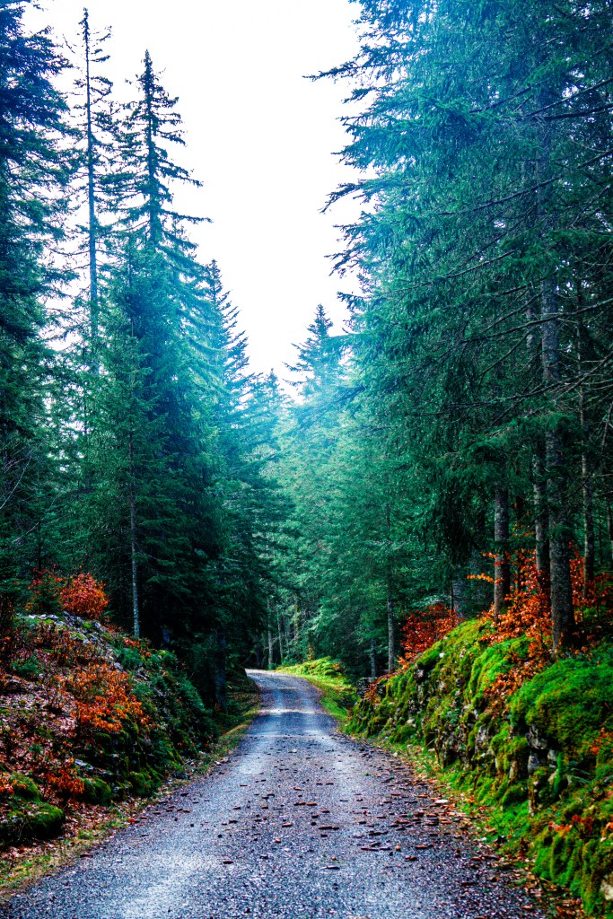 Lors de notre randonnée, malgré une météo peu clémente, nous avons été fascinés par la forêt. Dès que le regard quitte le sentier (d’ailleurs très bien marqué !), il se perd dans les tapis de mousse d’un vert vif et des épicéas qui font grise mine. Le sentier alterne entre passages goudronnés, chemins forestiers et sentiers de randonnée. Ce sont ces derniers qui sont les plus agréables et qui donnent l’impression de plonger dans une forêt vierge et protégée.