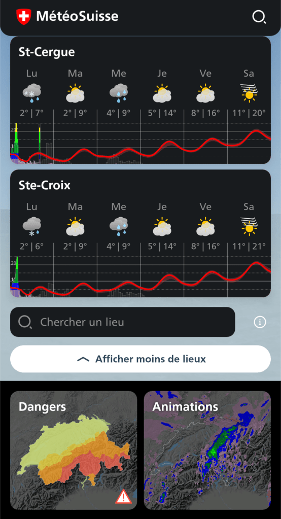 La météo est à mon sens le facteur le plus important en randonnée, que cela soit à la journée ou en trek. Avoir une application fiable qui permet de se préparer mentalement à ce qui va venir et d’adapter son parcours en fonction est très précieux. Lorsque vous êtes en randonnée, recevoir une alerte concernant une tempête estivale est très précieux pour se mettre à l’abri. En enregistrant plusieurs endroits vous pouvez anticiper à quoi ressembleront vos prochains jours et évaluer la pertinence de vos plan B. Et tout cela pour pas un rond ? Merci la Confédération !